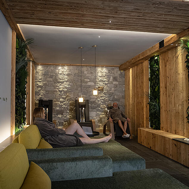 In unserem Wellnesscenter mit spektakulärem Blick auf die Pale di San Martino.