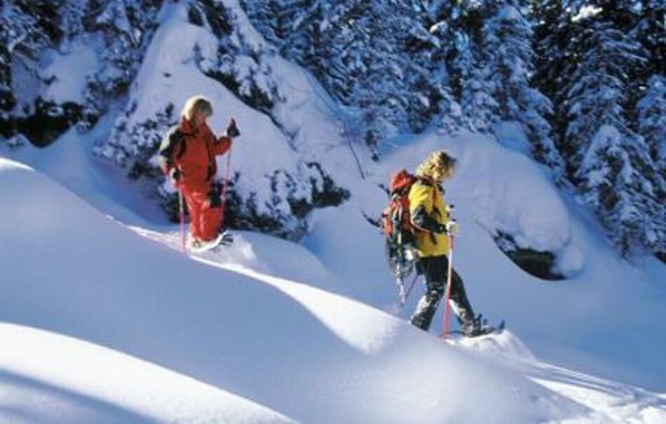 Schneeschuhe, Nordic-Walking-Stöcke und Rucksäcke vorhanden