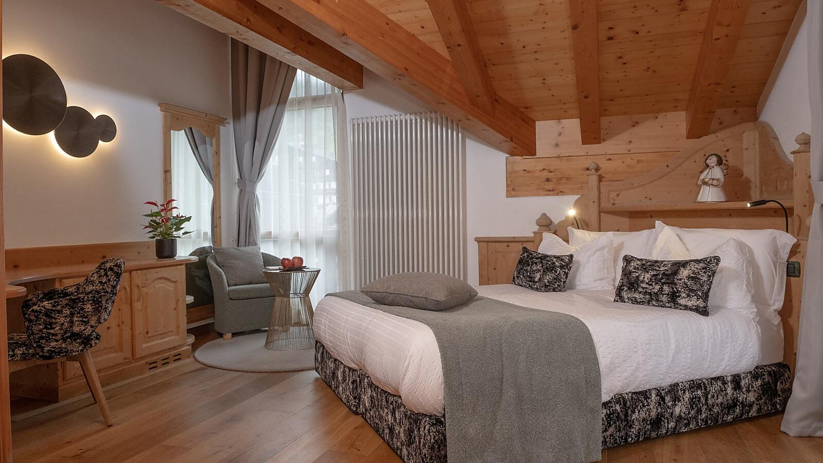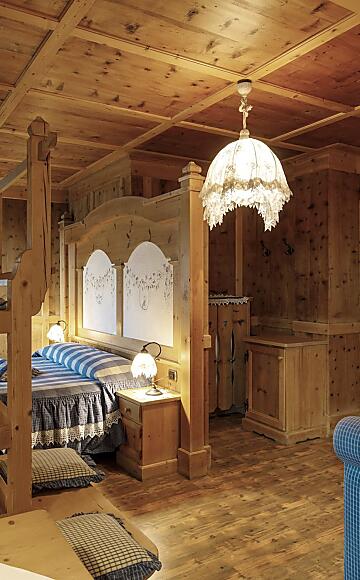 Con le Junior Suite aumenta lo spazio e aumentano anche i comfort. Si tratta infatti di camere arredate in stile montano, con balcone e adatte per 2/3 persone.